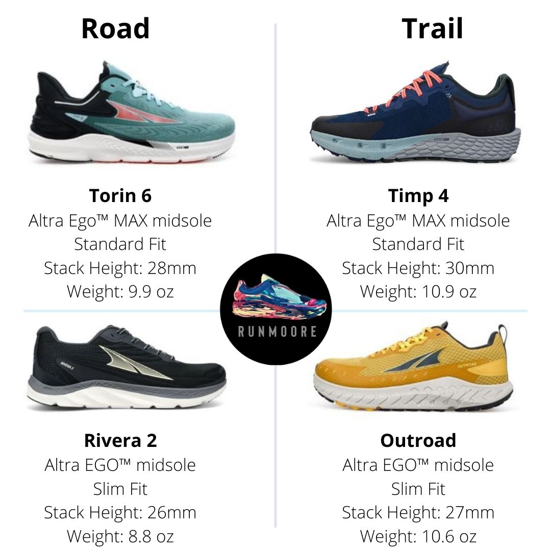 If you are looking to see how Altras all connect. The Timp is the trial version of the Torin as they both have an EGO MAX midsole and a standard fit. Now the Outroad is the trail equivalent of the new Altra Rivera 2.