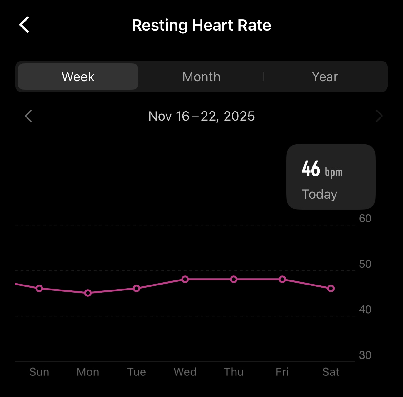 Just as satisfying as a super-high heart rate spike is a low resting heart rate. I used to use my lowest sleeping number as my “low,” but I recently switched to my lowest awake heart rate. It just feels more fair. And let’s be honest: it’s a runner flex when someone in the medical field sees your vitals and says, “You must be an endurance athlete.” It’s the best badge of honor. Conversely, when you’ve been off the grind, eating poorly, or just getting into running, a normal resting heart rate can be 20+ beats higher than a runner’s.